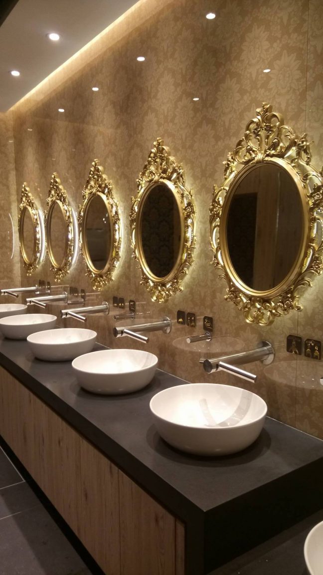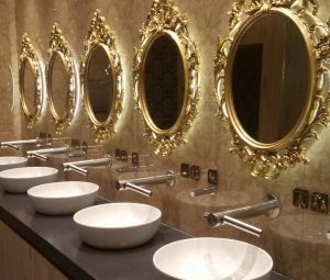 Wygląd naprawdę zwala z nóg: jest nowocześnie, przestronnie i luksusowo. Wchodząc do toalet poczujesz się jak w pałacu. Kanapy, złote lustra i orchidee to dość nietypowy element wystroju łazienki w galerii.