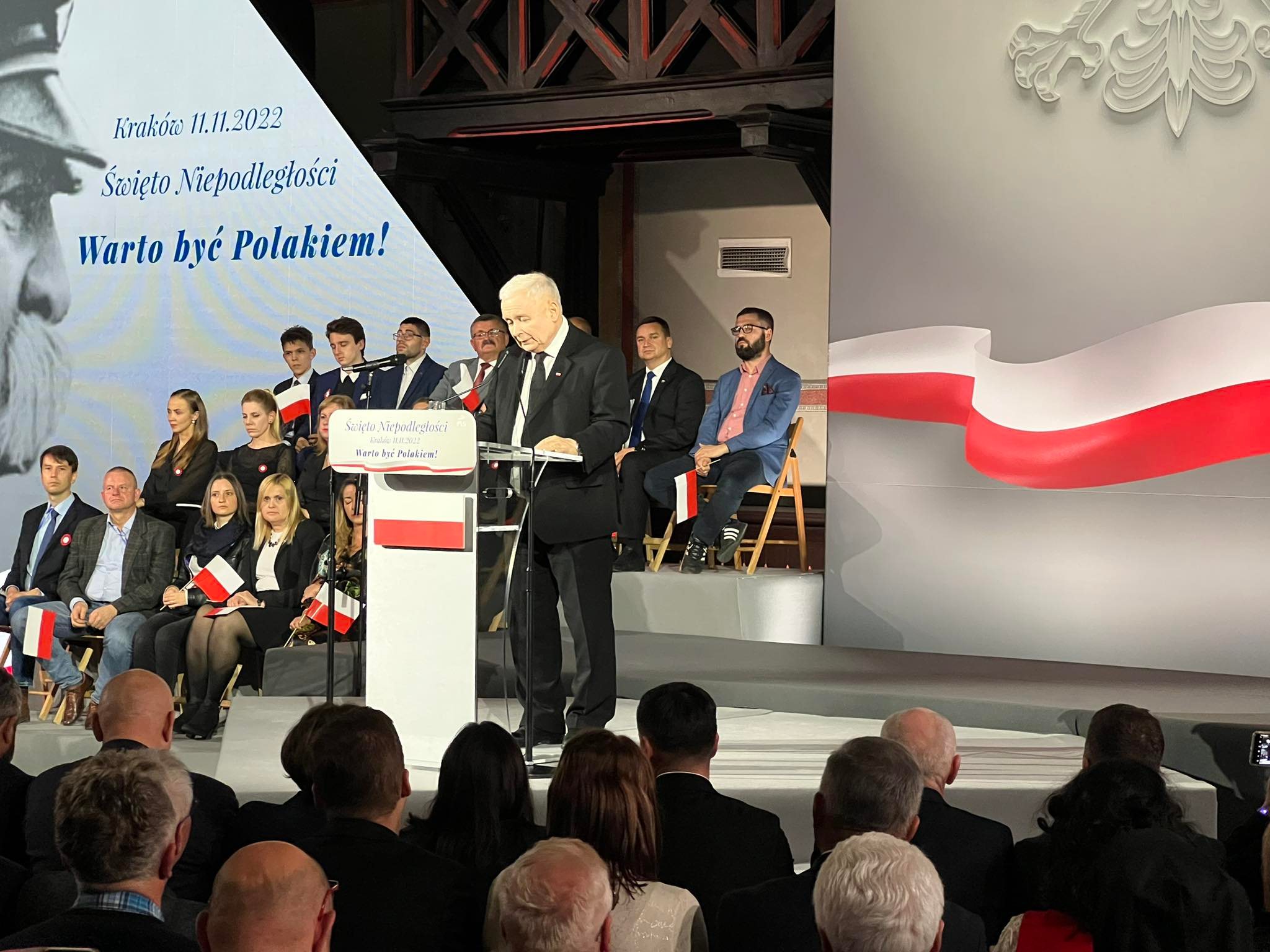 Do Krakowa na obchody Narodowego Święta Niepodległości przyjechali najważniejsi politycy PiS. Oprócz Jarosława Kaczyńskiego w hali Sokoła byli m.in. Mateusz Morawiecki, Piotr Gliński, Joachim Brudziński, Antoni Macierewicz, Ryszard Terlecki i Andrzej Adamczyk. Po spotkaniu prezes PiS w towarzystwie innych polityków PiS złożył kwiaty pod pomnikiem Józefa Piłsudskiego.