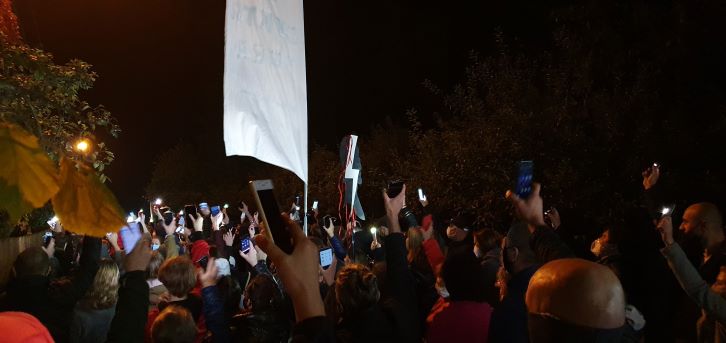 Krzeszowice. Wieczorny protest pod domem posła Andrzeja Adamczyka. Z hymnem i wyzwiskami [video, zdjęcia]