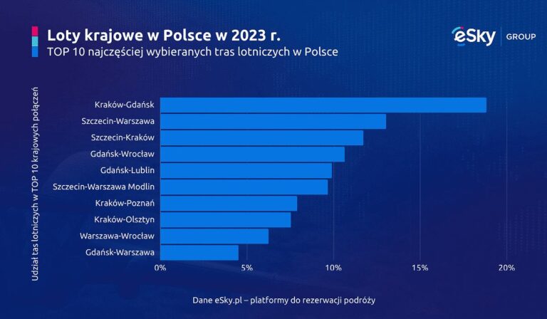 Najczęściej wybierane w tym roku loty to te łączące Gdańsk i Kraków, wynika z raportu platformy do rezerwacji podróży eSky.pl. W swojej analizie eksperci eSky.pl biorą pod lupę loty krajowe w 2023 roku, pokazując najbardziej oblegane trasy i średnie ceny biletów lotniczych