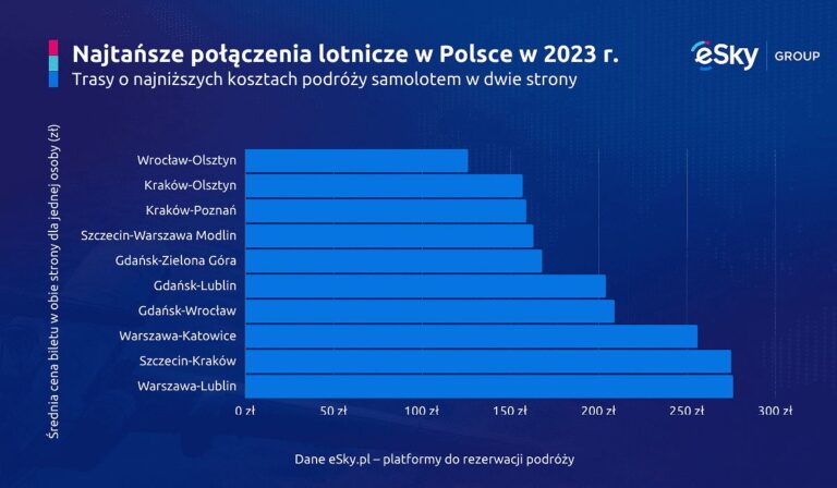 Lista 10 najpopularniejszych krajowych tras w 2023 r. obejmuje loty łączące Warszawę z Wrocławiem (9. pozycja, 6 proc.) i Gdańskiem (10. miejsce, 4 proc.). Dla połączenia Warszawa-Wrocław koszt podróży w jedną stronę wynosił średnio 290 zł i dwa razy tyle – 556 zł – w obie strony. Natomiast za loty między polską stolicą a Gdańskiem w jedną i dwie strony Polacy płacili odpowiednio 269 zł i 451 zł.