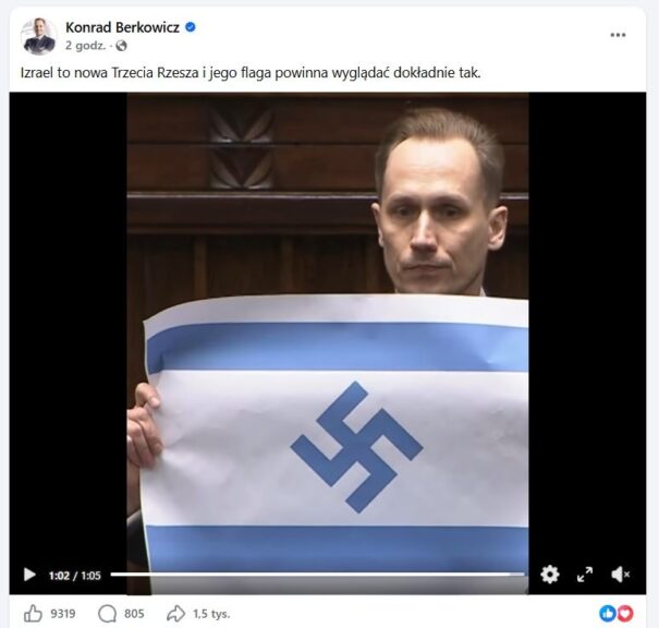 Podczas wystąpienia w Sejmie poseł Konrad Berkowicz z Konfederacji pokazał flagę Izraela ze swastyką. – Izrael to nowa Trzecia Rzesza i jego flaga powinna wyglądać dokładnie tak – stwierdził poseł z Krakowa rozwijając kartkę z barwami państwowymi Izraela i swastyką umieszczoną w centralnym miejscu.