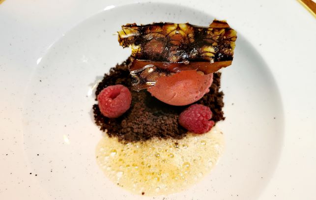 Jeśli zarezerwujecie oba zestawy, koniecznie spróbujcie swoich deserów! W wersji wegańskiej jest to beza z aquafaby, czyli wody po gotowaniu ciecierzycy, którą można ubić idealnie tak samo jak kurze białko. Podana z musem z mango i ziemią z 80-procentowej gorzkiej czekolady stanowi idealne połączenie słodyczy i kwasowości z lekkim gorzkawym twistem. Drugi deser zbudowano na… piwie: smak malinowego sorbetu przełamuje tu piana z portera, którego użyto też do do “szklanej” , całkowicie jadalnej ozdoby wieńczącej całą kompozycję.