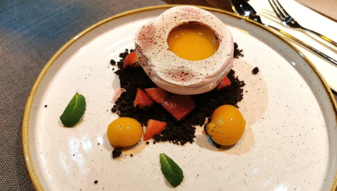 Jeśli zarezerwujecie oba zestawy, koniecznie spróbujcie swoich deserów! W wersji wegańskiej jest to beza z aquafaby, czyli wody po gotowaniu ciecierzycy, którą można ubić idealnie tak samo jak kurze białko. Podana z musem z mango i ziemią z 80-procentowej gorzkiej czekolady stanowi idealne połączenie słodyczy i kwasowości z lekkim gorzkawym twistem. Drugi deser zbudowano na… piwie: smak malinowego sorbetu przełamuje tu piana z portera, którego użyto też do do “szklanej” , całkowicie jadalnej ozdoby wieńczącej całą kompozycję.