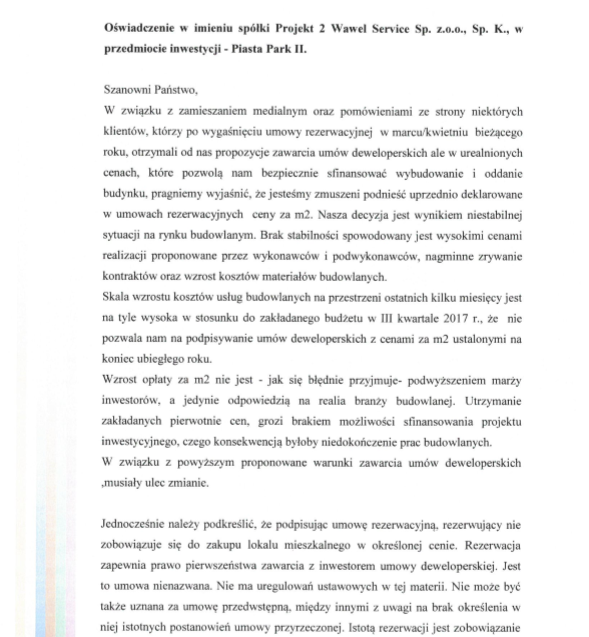 – Ten zapis pojawił się po to, żeby deweloper miał furtkę do dalszego dojenia kupujących – mówią oburzeni klienci, którzy chcieli zamieszkać na nowo budowanym osiedlu Piasta Park II na Mistrzejowicach. Czują się oszukani przez inwestora, który – mimo podpisania wstępnych umów – podnosi ceny lokali.