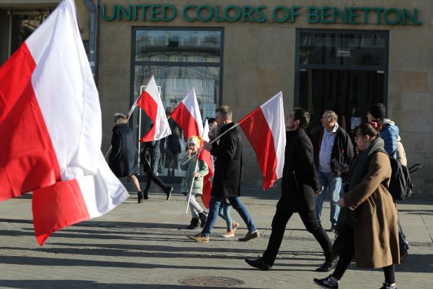 Wśród krakowian rozdano wiele flag w polskich barwach narodowych (fot. Bogusław Świerzowski/krakow.pl)