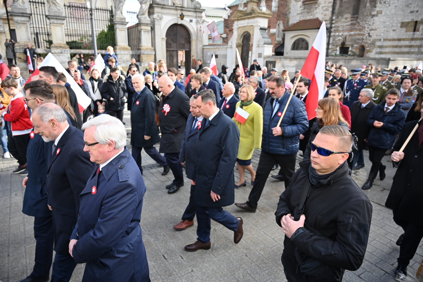 Uroczystej mszy świętej w intencji Ojczyzny, odprawionej w katedrze Wawelskiej, przewodniczył metropolita krakowski arcybiskup Marek Jędraszewski. Tuż po zakończeniu nabożeństwa na Wzgórzu Wawelskim rozdawano flagi państwowe, chorągiewki i okolicznościowe kotyliony. Potem uformował się pochód patriotyczny, który Drogą królewską przeszedł na plac Matejki. Tam odbyła się główna część krakowskich obchodów.