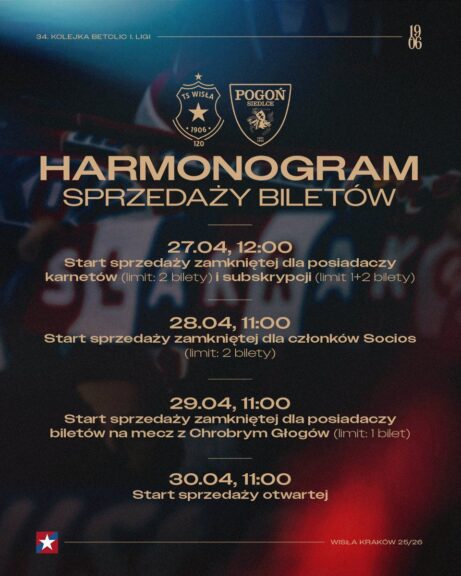 – Przygotowaliśmy harmonogram sprzedaży, który obejmuje etapy zamknięte dla posiadaczy karnetów, subskrypcji, członków Socios Wisła oraz posiadaczy biletów na mecz z Chrobrym Głogów, a następnie sprzedaż otwartą. Zapoznajcie się ze szczegółami i zaplanujcie swoją obecność na stadionie, bo to będzie ważny dzień – napisała Wisła i przedstawiła poniższy harmonogram: